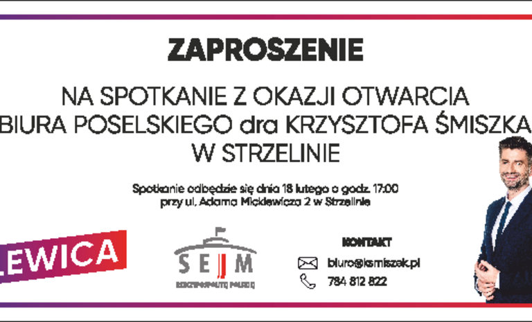 Zapraszamy na otwarcie biura poselskiego posła na sejm RP dr Krzysztofa Śmiszka w Miliczu. Uroczyste otwarcie i spotkanie z mieszkańcami rozpocznie się o godz. 17.00 przy ul. ...