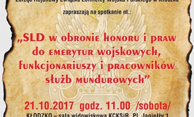 "SLD w obronie honoru i praw do emerytur wojskowych, funkcjonariuszy i pracowników służb mundurowych"21 października br. godz. 11.00; Kłodzko - sala widowiskowa KCKSiR, Pl. Jagiełły 1;Spotkanie jest otwarte - wstęp wolny!