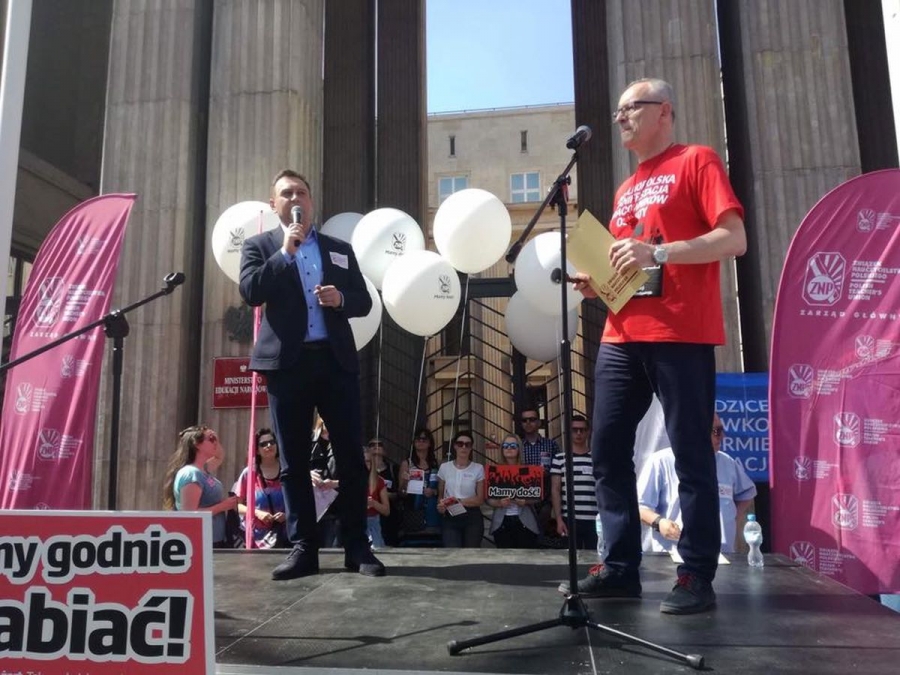 Ponad 5 tysięcy manifestantów - nauczycieli, rodziców i samorządowców - domagało się pod Ministerstwem Edukacji Narodowej godnych wynagrodzeń oraz dymisji Minister Edukacji Narodowej Anny Zalewskiej, która zdaniem protestujących szkodzi polskiej edukacji.